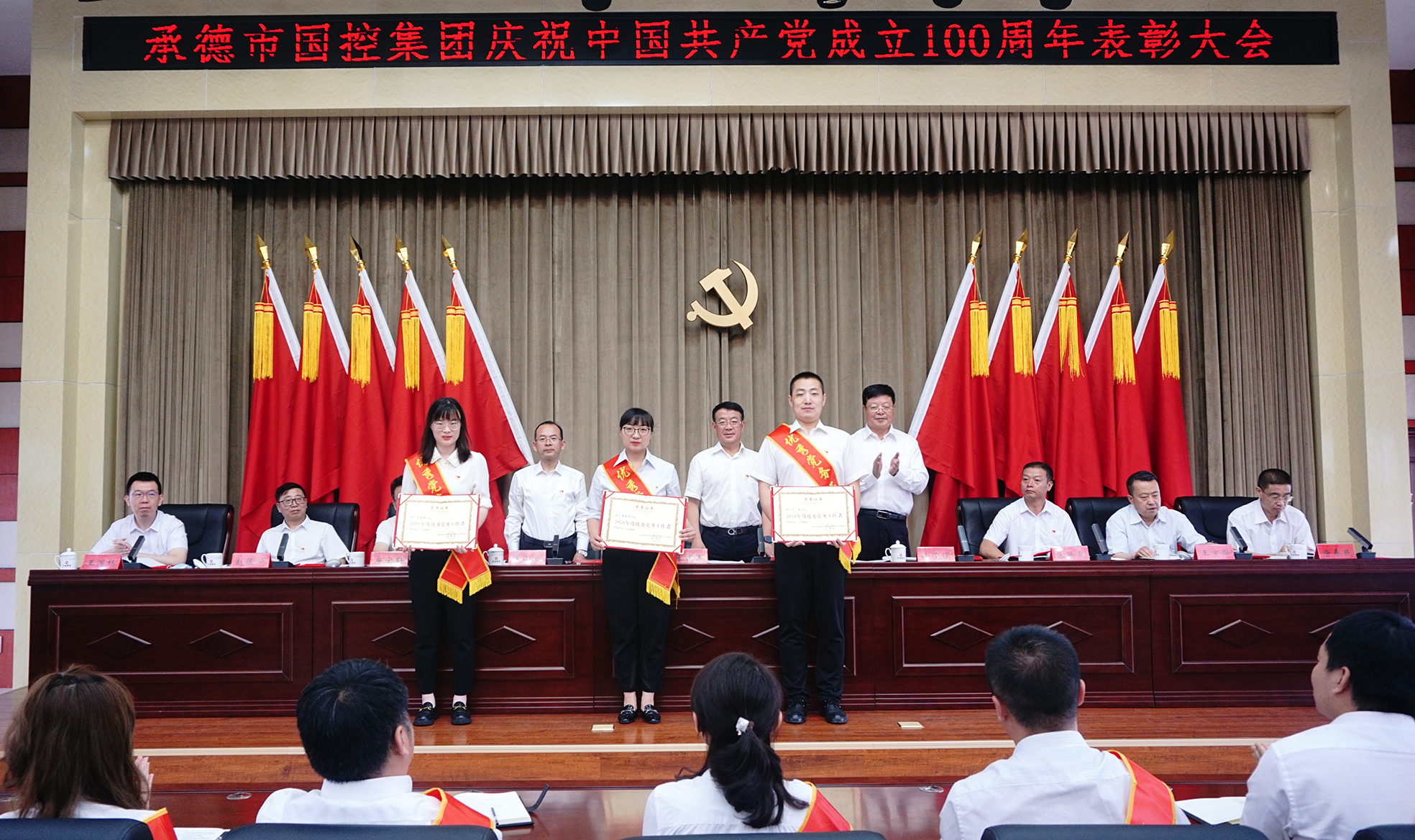 表彰大會(huì)氣氛隆重?zé)崃?,大?huì)在全場(chǎng)起立高唱國(guó)歌聲中開幕。集團(tuán)公司黨委決定,授予許平凡等7名共產(chǎn)黨員“優(yōu)秀共產(chǎn)黨員”稱號(hào),授予胡斌偉等3名黨務(wù)工作者“優(yōu)秀黨務(wù)工作者”稱號(hào)?,F(xiàn)場(chǎng)向先進(jìn)個(gè)人頒發(fā)了證書,并向參加“慶祝中國(guó)共產(chǎn)黨成立100周年書畫攝影大賽”獲獎(jiǎng)的人員頒發(fā)了榮譽(yù)證書。