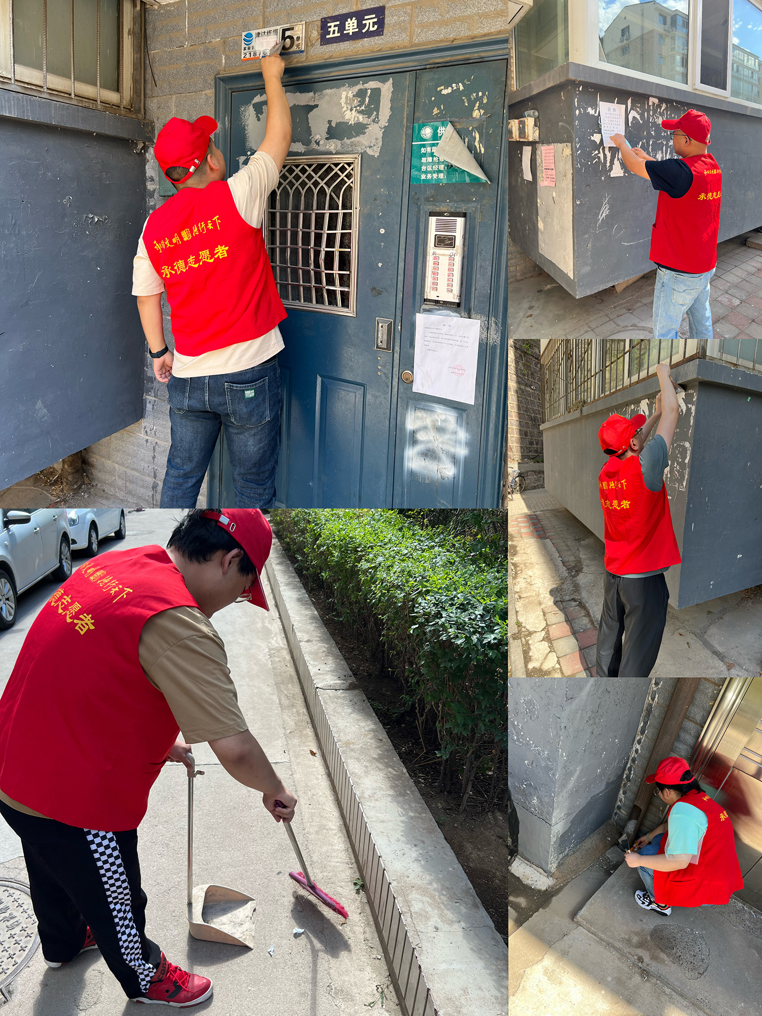 在活動現(xiàn)場,大家身穿紅色志愿者馬甲,手持鏟子、掃帚、簸箕等工具,在炎炎夏日中為小區(qū)居民打掃小區(qū)衛(wèi)生,著重清除非法小廣告以及衛(wèi)生死角、亂點(diǎn)。